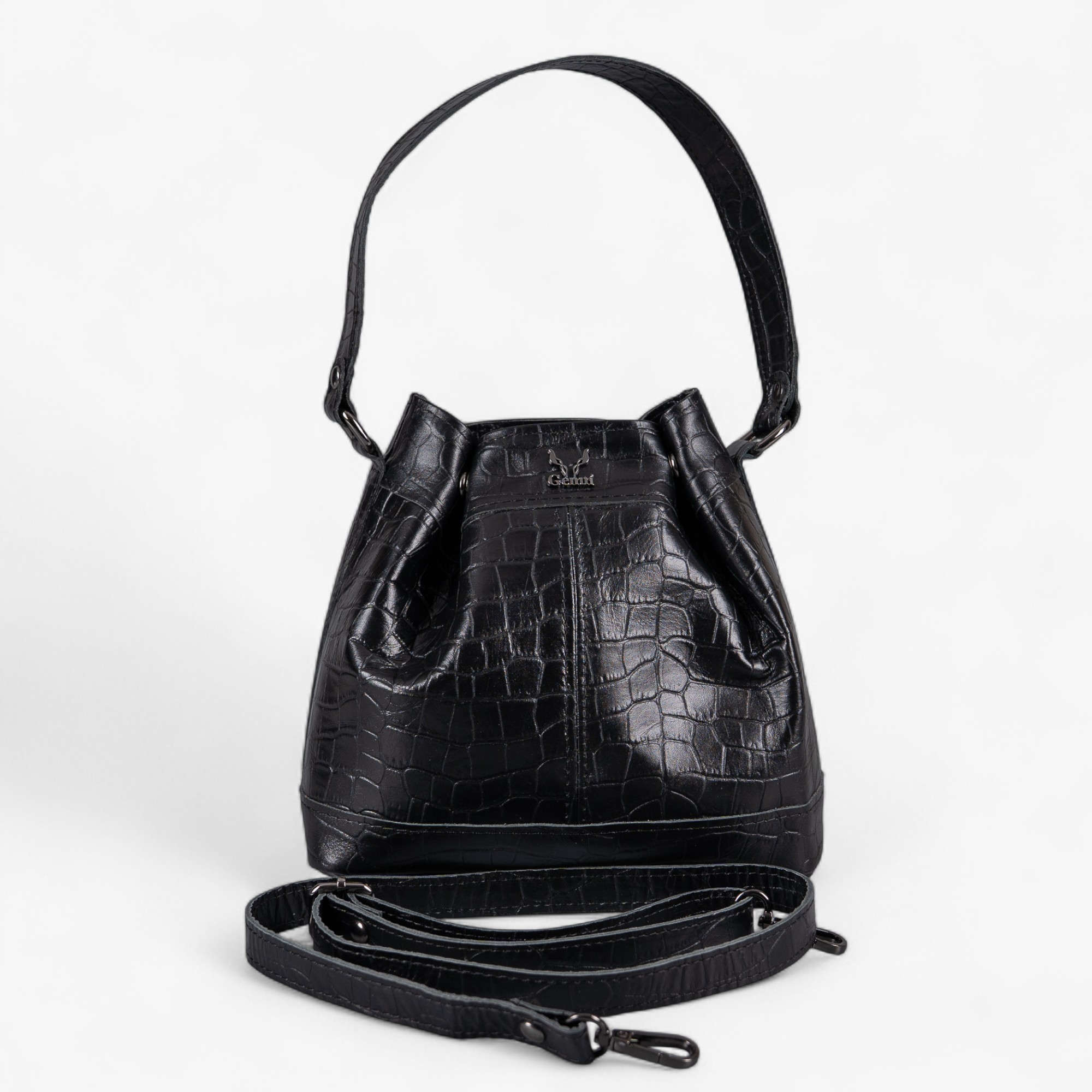 Handcrafted from genuine leather with a textured finish, it features a gold-tone metal logo on the front for an added touch of elegance.